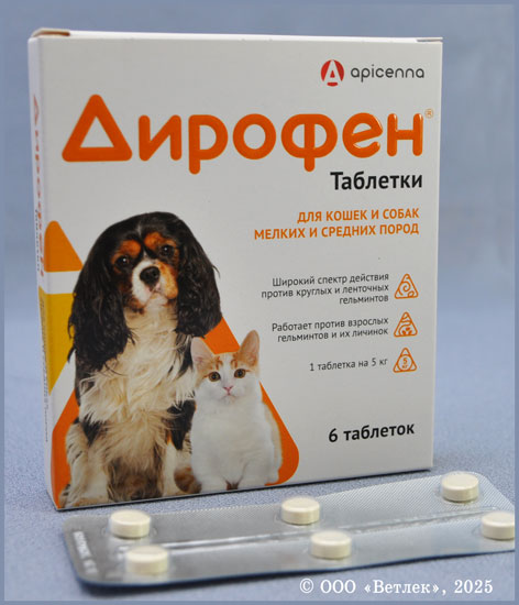 Дирофен таблетки для кошек и собак мелких и средних пород, уп. 6 таб.