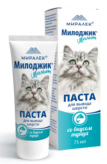 Милоджик Мальт представляет собой кормовую добавку в форме пасты и обладает привлекательным для кошек вкусом тунца, его можно давать как лакомство. Паста способствует естественному очищению желудочно-кишечного тракта кошек и котят от проглоченной после вылизывания шерсти и профилактики образования волосяных комков в ЖКТ.