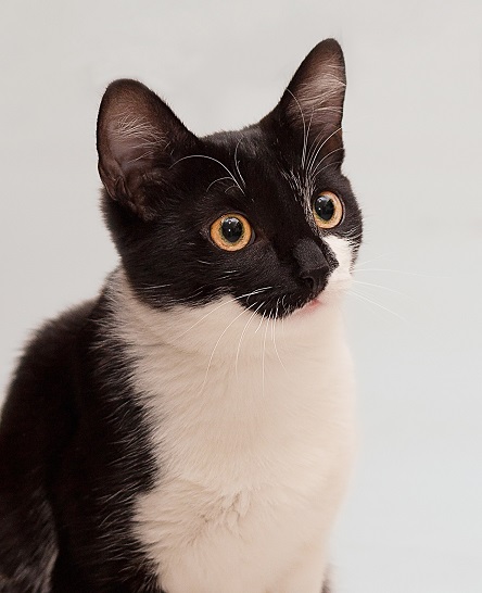 Короткошерстная, очень красиво раскрашена в черно — белые цвета, потрясающе нежная и мягкая шерстка.