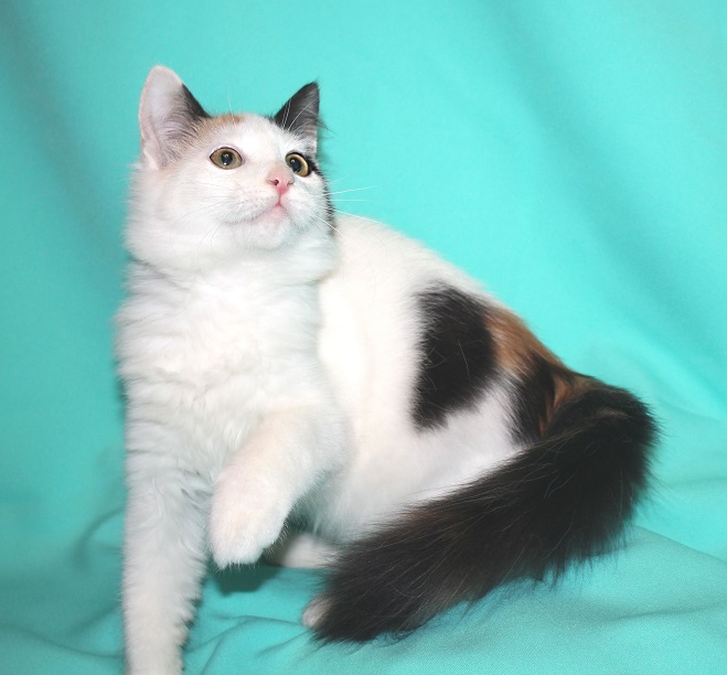 Девчушке 3 месяца, наряжена в красивую нежную белоснежную шубку ангорского типа, с темным хвостиком, а ещё на ней милейшая двухцветная шляпка!