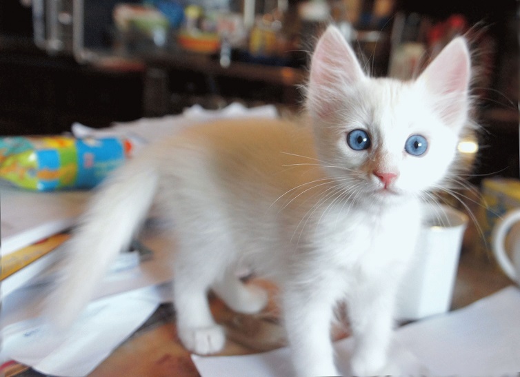 На голове у котенка есть серое пятнышко в виде скобочки — на фотографиях видно, что не портит ее красоты и гарантия того, что кошка не глухая.