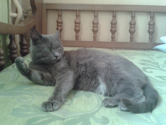 Эта кошка – настоящая красавица. Шерсть цвета маренго, изумрудные глаза, темные перчатки на лапках. Она неторопливая и вальяжная. Ненавязчивая, но отзывчивая на ласку. Любит покушать, но в еде неприхотлива.