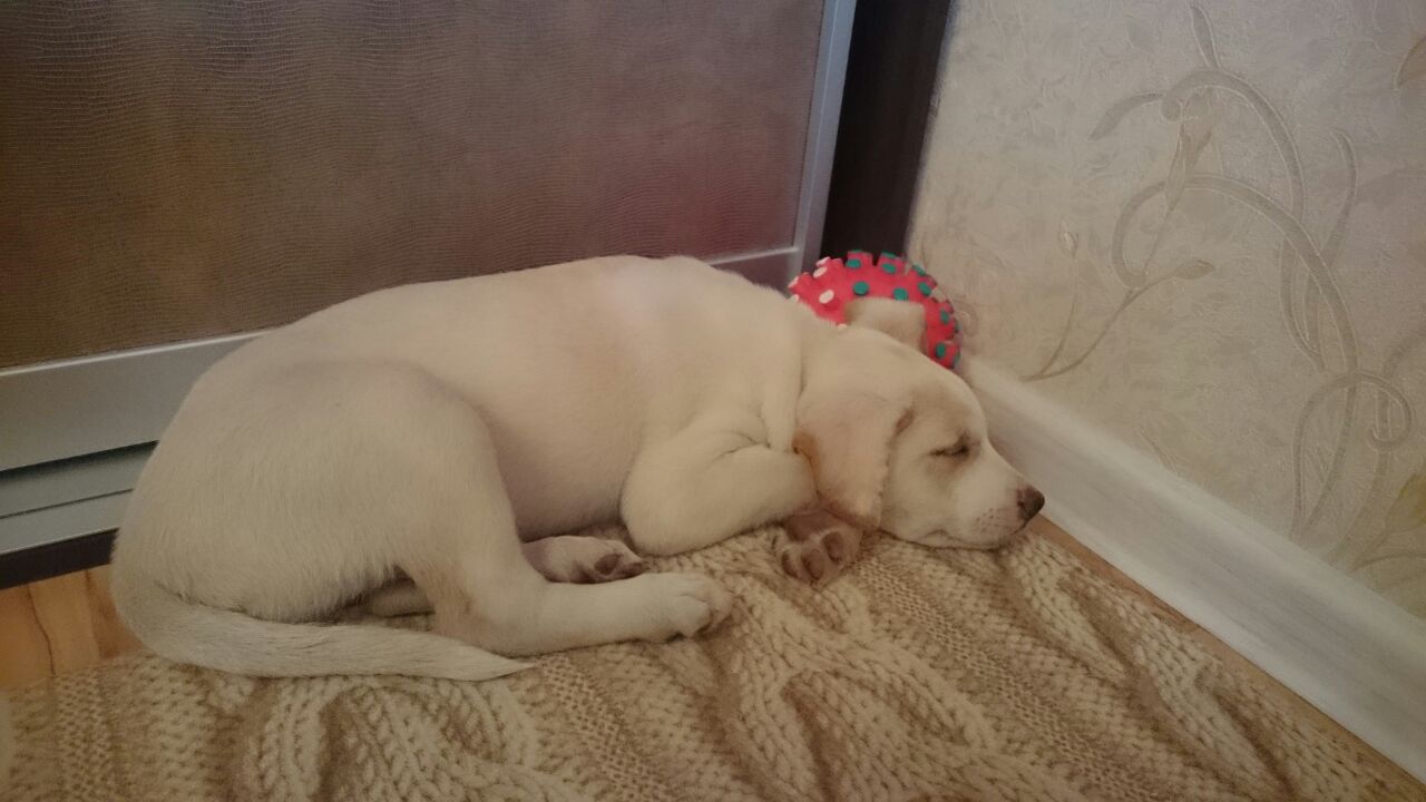 Девочка, предположительно метис лабрадора. По возрасту совсем кроха, примерно 1,5 мес. Платинового окраса.