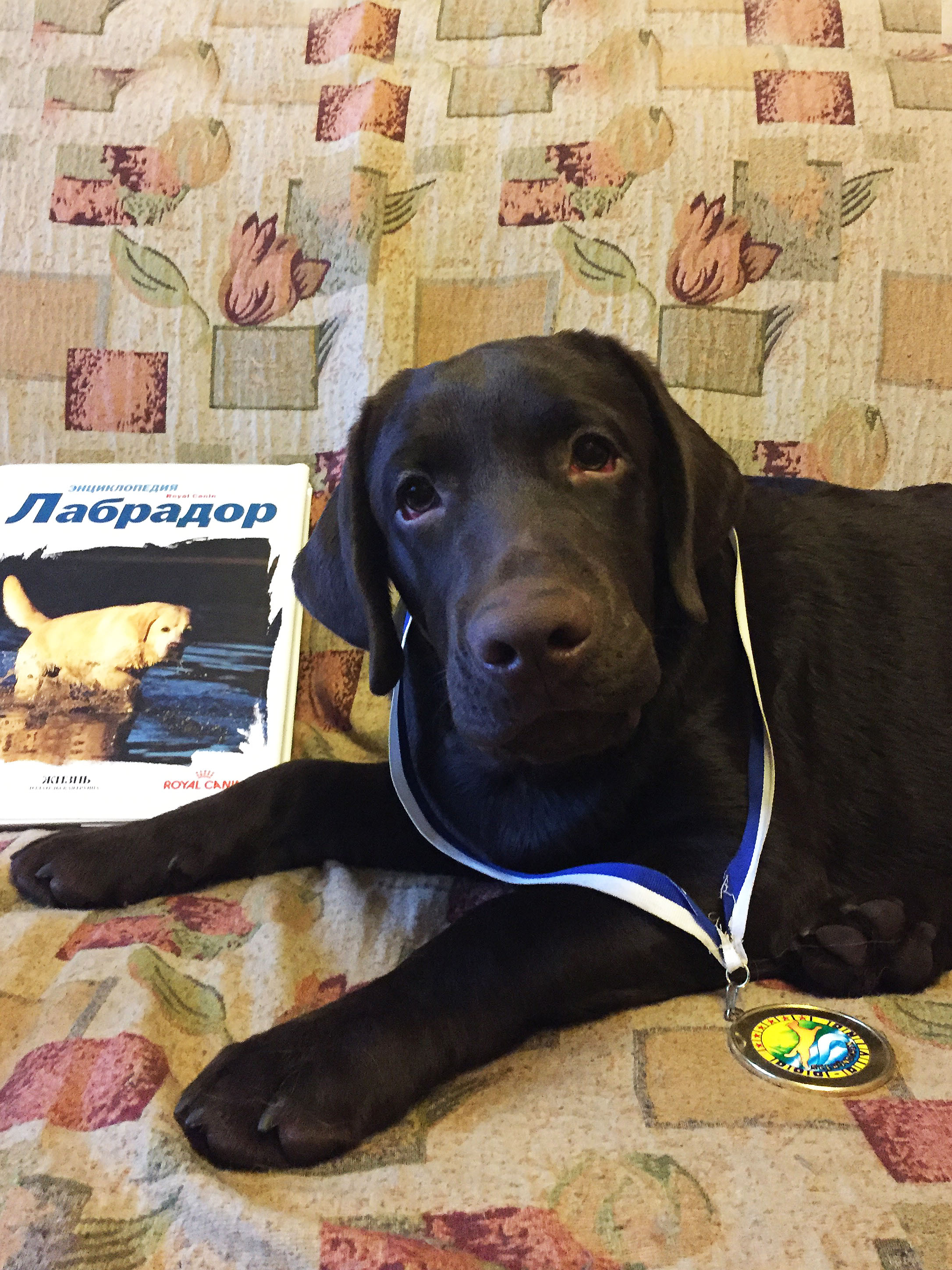 Темношоколадный окрас, темнее мамы, прикус ножницы, все в норме. Заядлый апортировщик, тусовщик и игрун..