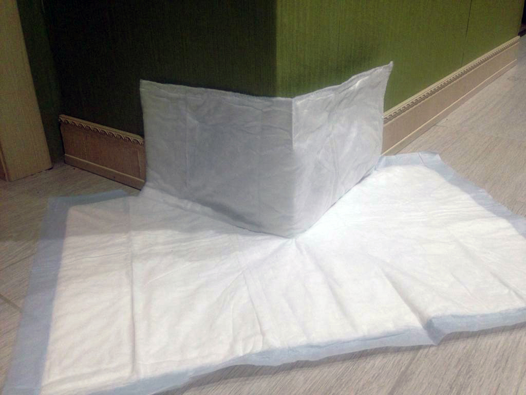 Мы производим пелёнки с защитным экраном для углов многоразового использования. Это твёрдая плёнка, закрывающая Ваш угол, крепящаяся к плинтусу, стене, мебели и т.д., не оставляющая следов и не портящая их. Снизу к ней просто кладётся пелёнка с вырезом. Экран прилагается в комплекте с пелёнкой.