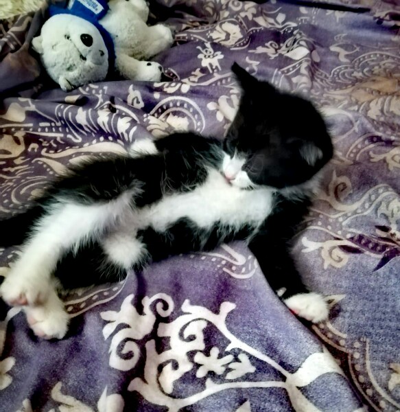 Кошечка очень нарядная: белый лобик, грудка и перчатки. Лоток нашла сразу. Чистенькая и скромная. Людей не боится, быть на руках - обожает. Когда начинает волноватся и хныкать - достаточно взять на руки, и она сразу успокаивается.