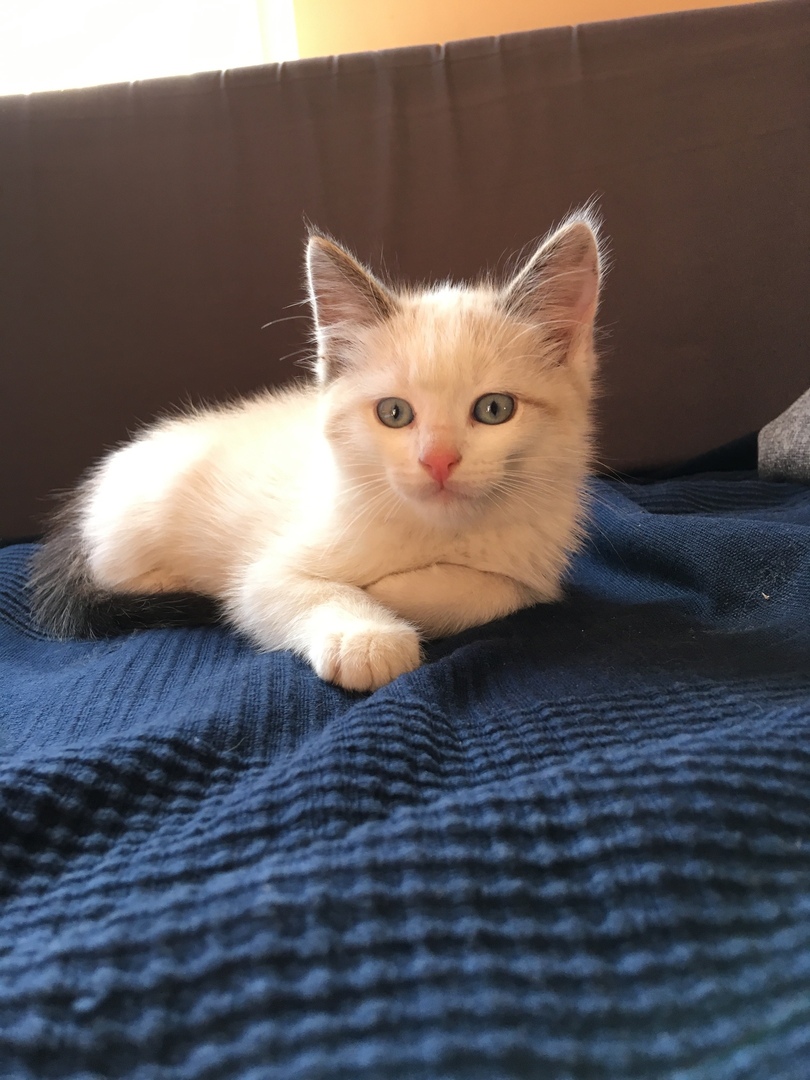 Возраст примерно 2,5 месяца. Светлый окрас, прекрасный розовый нос и тёмный хвостик. Ручной, ласковый, воспитанный, лоток знает на отлично.