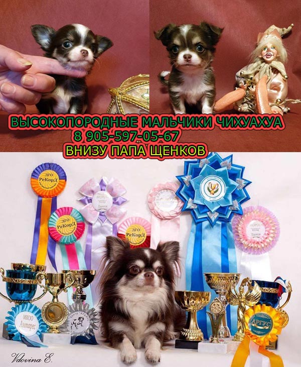 Новое сообщениеПитомник Элит-Элегант http://toichih.narod.ru/ предлагает очень красивых, ухоженных щенков Чихуахуа. Приобретая в нашем питомнике щенка Вы получаете здоровое животное, с прекрасным характером, великолепным выставочным экстерьером, воспитанное, приученое к чистоте, привитое от основных заболеваний, с документами РКФ/FCI. Участие в выставках приветствуется, но не навязывается. У нас Вы всегда сможете выбрать щенка по вашему вкусу, и по вашим возможностям. Звоните т. 8 905-597-05-67 – опытный кинолог ответит на все Ваши вопросы. А ещё лучше – приезжайте, выберите щенка соответствующего Вашим требованиям, обсудите цену и время когда Вам будет удобно забрать малыша.