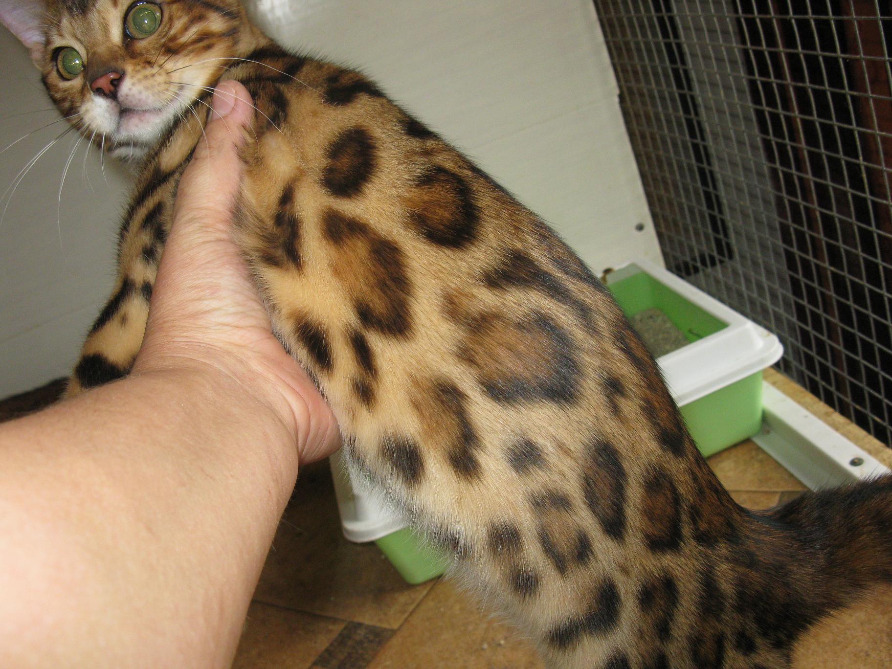 Бенгальчики имеют яркий, контрастный окрас -крупная розетка на золоте. Цвет глаз зеленый изумрудный. Крупные, с хорошо развитым костяком.