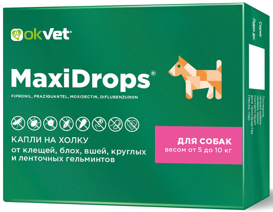 Подробная инструкция по применению МаксиДропс для собак от 5 до 10 кг, пипетка 1,0 мл.