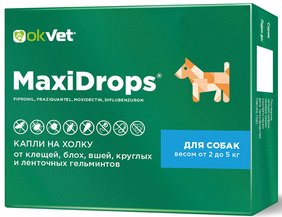 Подробная инструкция по применению МаксиДропс для собак от 2 до 5 кг, пипетка 0,5 мл.