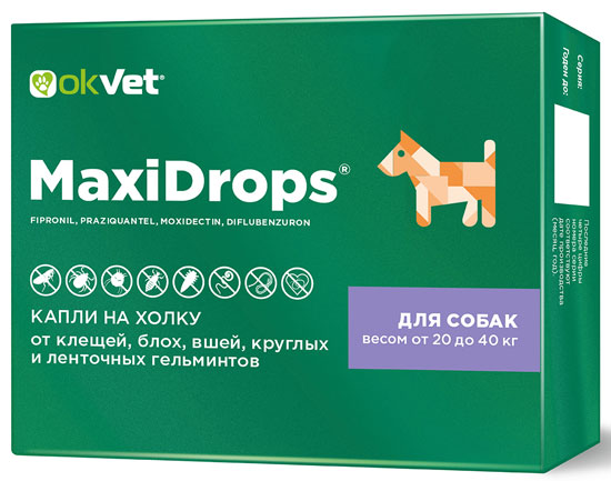 Подробная инструкция по применению МаксиДропс для собак от 20 до 40 кг, пипетка 4 мл.