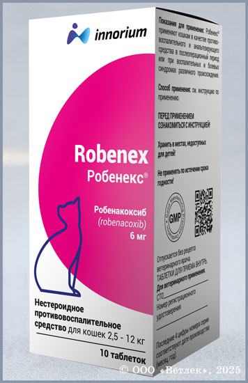 Робенекс применяют собакам и кошкам в качестве противовоспалительного и анальгезирующего средства в послеоперационный период или при воспалительных и болевых синдромах различного происхождения.