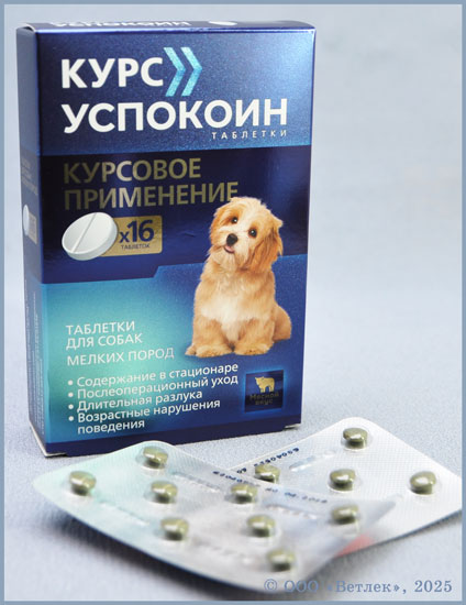 Курс Успокоин таблетки назначают собакам для снижения возбуждения: при хроническом страхе и тревоге, выраженном в беспокойстве, вокализации, мечении территории, повреждении предметов быта, возникающих при разлуке с хозяином, занятиях с кинологом, участии в выставках и т.п.