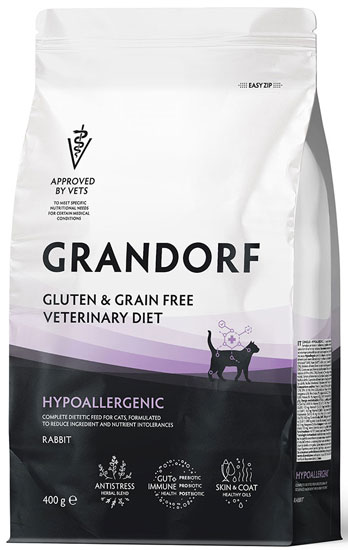 Подробная инструкция по применению Ветеринарная диета для кошек при пищевой аллергии или пищевой непереносимости (Grandorf HYPOALLERGENIC), уп. 400 г.